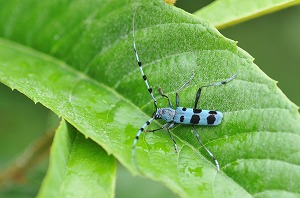 ルリボシカミキリ 8月、庭のビワの葉にとまっていたルリボシカミキリ。青みのある空色の下地が黒斑を印象的に際立たせています。触覚の先まで続く青と黒のコントラストは意外に美しい。ふとカケスの翼にある紋様を思い出しました。 |