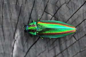 タマムシ 9月に庭の腰掛け用の丸太の上に御遺体を見つけました。この光り輝く金属光沢は色素ではなく、羽が薄い膜を何層も重ねた構造をしていて光の反射を変化させるために起こるものだそうです。「構造色」と言います。御遺体でもその色合いは変化しないので、古来工芸品などに使われてきました。 |