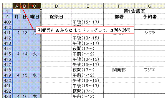 条件付き書式の設定は、選択中のセル範囲の左上隅を基点とします。作例では、A〜C列のすべてのセルを選択しているので、その左上隅はA1セルとなります。