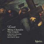 リストは、この曲を、合唱、ピアノソロ、オルガンソロの3つのヴァージョンで作ったと見られており、どのような形で演奏しても構わないと考えていたようです。実は、私が最初に聴いたのがピアノ伴奏のデ・レーウ盤でした。これは、思い切り抑制されたアプローチで、とても衝撃的な演奏でした。今回はオルガン伴奏、合唱もロマン派以降の作品にかけては右に出るものがないコリドン・シンガーズとあって、デ・レーウ盤とは全く異なる表現。あくまでロマン派のリストが聴けます。