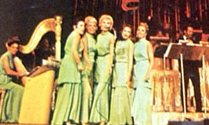 さらに、この裏焼きになってしまったライブアルバムの写真を、そのまま別の2-on-1に使っているものもあったりして、そのおおらかさには脱帽させられてしまいますね。かと思うと、このアルバムの裏側では何とも手の込んだことをやっていて、驚かされます。よく見て下さい。ここにいる「5人」の女声コーラスは、もともとは一部がレイの足に隠れていた「8人」のメンバーの端っこをつなぎ合わせたものなのですよ。これは、さしずめ、「8-on-5」ということにでもなるのでしょうか。(レコーディングの際は各パート2人のようですが、コンサートでは、このように1パート4人、つまり女声は8人という編成をとっています)