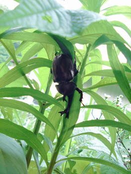 日中彼らが休んでいる場所は、樹が生い茂った枝の間、草むらの中、 枯葉の下、樹液が出ている木の根元などで暗くて涼しい場所に好んでいます。 でもそれは、全部のカブトムシに言えるわけではなく、7月の後半に入ると 樹液場のあちらこちらで日中からカブトムシが群がっている光景を目にします。 数が増え始めるカブトムシ甲虫類たちの需要と樹液を出す樹木の供給の バランスが崩れる頃から段々と昼間から彼らを見ることが出来るようになります。 私の考えですが、樹液を出す木はある程度数は限られています。 5.6月頃までは樹液酒場と甲虫の数は、なんとかバランスがとれており 夜の営業の時間だけで、ほぼすべての甲虫がなんとかお腹いっぱい食事がとれ 明るくなる頃には休む場所を求めて帰っていく。 そのため昼間からカブトムシ・クワガタムシを見る事があまりないと考えます。 ところが7月頃から甲虫たちが増え始めると夜の樹液酒場は常に満席状態。 場所取りで戦いに敗れたカブトムシ達は、勝者が消え去った後に一杯やるため 朝方、時には日中までも樹液酒場にとどまることになってしまうことになるのでは ないでしょうか。 |