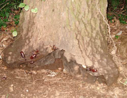 | なかなか夜、かぶとむし採集にでられなかった子どもの頃は、捕まえに行くと言ったらもっぱら昼間の公園や近所の林でした。 子どもの頃の知識というと、友達や学校の先生、親からの情報だけで 1.ゴツゴツした木にいる。2.蜜を出す木にいる。3.昼は土の中にもぐっている。ぐらいでした。 今思うとよくこんな知識だけで林に出かけてたなと思います。(でも運が良いとたまに捕まえられる事もありました。) 今は、昔と違いインターネットで探したり昆虫図鑑や雑誌も豊富で捕まえ方の情報は今よりもずっと多いと思います。 でも昼間の採集の説明に関しては、ちゃんと説明している本はまだまだ少なく、「かぶとむしは、夜行性で昼間は、木の根元や枯葉、土の中にもぐっている。」 というような感じで書かれている事が多いです。そのせいか公園などにある木の根元は、あたりかまわず掘られ根がむきだし状態なんて事があります。 木が傷まないようにちゃんと埋め戻しておいてくれればいいのですが大抵はそのままの状態です。 そういう私も子どもの頃は、木の根元を掘った記憶がありますが、その時捕まえたという記憶はありません。では、日中はどこを探せばよいのでしょう |