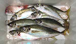 船頭が無線で状況を聞いているが他の船もダメみたい。ちょこちょこポイントを移動し群れを探しているようだが相変わらずアタリはない。そうしている内に相棒は船酔いでダウン。その後、場所替えしたところでようやくアジが来た。タナはどうやら高いみたい。底から4回巻いて3番目のハリに掛かっている。底べったりで下ハリに掛かることが多いのに。それと食いが渋い。待っていてはほとんど掛からない。前アタリが出たら誘い上げたり、送り込んだりしてやっとググと持っていく。そのポイントで3匹釣れた。小一時間そのポイントで流したが、一気に場所移動。 |