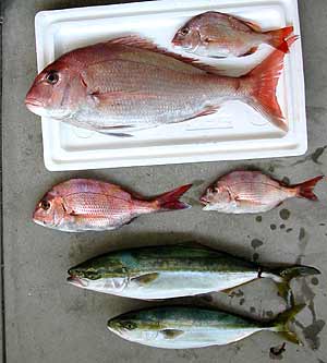 その次の流しでは仕掛けを上げる合図で巻き上げようとした瞬間、ハマチ(ツバス)がかかる。さっきよりも楽にあがったのは40センチ。やっとカッコは付くかな、ハマチ2匹あれば。 |