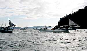 ウワテには5〜6隻が集まっている。虎島をつなぐ低い場所の前から流し始めるがアタリはない。徐々に虎島の先端に近づく。虎島から中戸の上手に流れる潮。今日は9時くらいが潮時。もうその時間は近い。しかし誰にも釣れない。辛抱に誘っていると、22回くらいのところでグーっと重くなる。そのまま誘うと重々しく竿を引き込む。一気にラインが引き出される。ちょっとドラグがゆるいかな?と思っていると、再びラインが引き出される。まずいと思うまもなくバラシ。引き出され過ぎるとたまにこうなる。掛かりが浅いときはラインを出してはいけない。ラインを出さないことでハリがしっかり掛かるからと思っている。 |