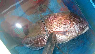 中戸の流しの終わり際でイワシがわき出した。ちょうどそこに差し掛かったときだ。三回くらい誘っていると、ガツガツ、ギュギューン〜〜、ブチィ〜。うん?なんだ? ゴンゴン、ギューン、ブチ。ん、なんやねん??。 数秒後、ブルブル、ゴンゴン、ギューンっとロッドを持っていかれる。一 気に走って止まって頭を振る。前回の大判と同じような引きだ 。こりゃ大鯛や。またギューンと走る。船頭はメジロちゃう? っという。確かにパワーがあり過ぎるが鯛の引きもちゃんとしている。でもやっぱりなかなか止まらないからメジロかな? ハリスは3号だからムリはできない。船中の仕掛けを全部上げてもらっているからじっくりやり取り。潮上に逃げて行くから右ミヨシから左に回ってやり取り。メジロらしき奴が水面 で跳ねる。ん、僕の奴か??また潮下に走る。再び左から右にまた移動。 なぜか引きが急に弱まり、重みだけになる。仕掛けがつかめるくらいまで上がってきたときのだが仕掛けが横に流されている。その先に大っきい鯛が浮かんでいるではありませんか! !。 オモリも切れて、浮き袋が膨らんだ鯛が急流にもまれている。 こんなところではずれたら拾えないやんか(笑)。鯛はもう引かないが流れが早く怖い怖い。なんとかタモにゲット。やりました〜。 上がって仕掛けを確認すると、オモリが切れ、針も下の三本が切れていた。思うに二つは当たった瞬間に切れたもの。もう一つはやり取りしていたときに切れたものでしょう。 メジロと大鯛が掛かったんだから片方だけでも取れたことはラッキーだと思います。その後は潮が早くなり、底取りが難しくなったため終了となりました。