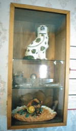 Birthplaceに比べるととても古いまま手入れをされていない感じがしました。壁紙も昔のままでしょう。この家の居間にもパイプオルガンが有りました。玄関ホールの正面にはストーリーガールで出てくる古時計がありました。右の写真は壁の飾り戸棚です。一番上にいるのがアンの炉辺荘の炉棚に飾ってあったゴッグとマゴグのマゴグの方です。ゴッグは残念ながら壊れてしまったようです。下の段にあるのが、ストーリーガールのレイチェル・ウォードの青い長持ちに入っていた「取っ手にりんごがついた瀬戸物の果物かご」です。