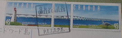自宅あてに郵便局から送った葉書です。ちょうどConfederation Bridge開通記念の切手が販売されていました。(カナダ全土で購入可能です。)でもスタンプは文字のみでちょっと残念。