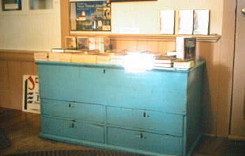 現在の入り口は裏口のキッチンです。ここにも大きなキッチンストーブがありこの日も火が入っていました。受け付け兼ブックストアーになっており、レイチェル・ウォードの青い長持ちの上にも彼女の本がびっしりと並べられていました。そのため最初は青い長持ちに気がつきませんでした。