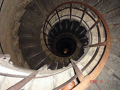 | 階段入り口(左)と約300段のらせん階段(右) | |