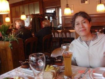 ここではびっくりの連続でした。サーベルのような剣にお肉が巻いてある料理(市長の剣というそうです)に引っかかりそうになるし、となりの外人さんの飲んでいるものにびっくりしたり。なんとでっかい花瓶みたいなものに黒ビールのようなものが入っていました。それを分けて飲んでいた、奥さんがまた我々に説明してくれましたが、「This’s Hot!」そういえば私たちがテーブルに付いたとき、ウェイターが何か火をつけて入れていました。