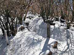 森の中の道 笹峰を過ぎると林の中を歩くようになる 登山道は雪に覆われていた |