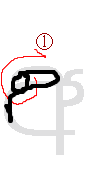 くるっと丸を書いたら線を右に延ばして左に急旋回、それからゆっくりと下におろして… | なだらかに右へ、柱となる直立の線をまっすぐに昇って、その直立の線をなぞって下へ降りて… | 今度はまた上へなぞって昇って、くるりと右に円を描いて…、できあがり。 |