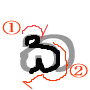 ①左上に碑内裏上に小さなマルを時計回りに書いて、そのまま一筆で下へ、②のところで左に行って、峯を立てて下へ戻って、… | 筆を上に向けて、左にちょっと尖がりを付けたらなだらかに右へ、②のところで輪を描いて筆を下ろします。 |