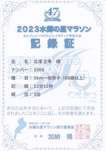 3km 70歳以上の部 優勝 11分57秒