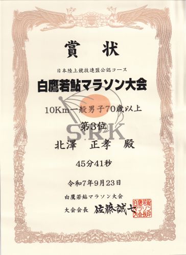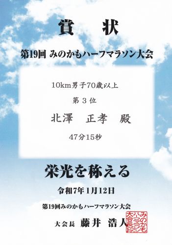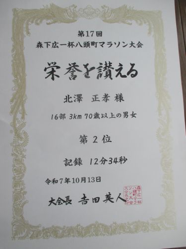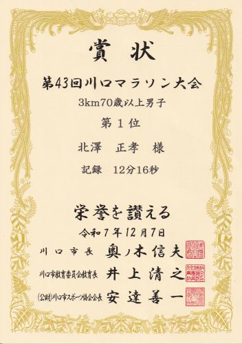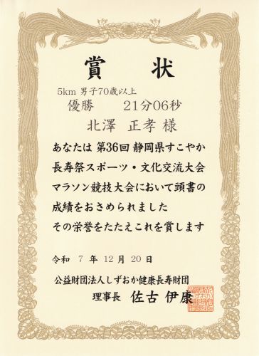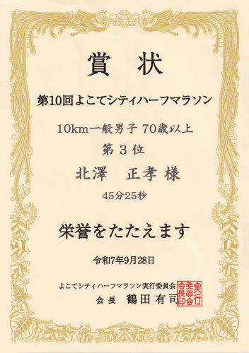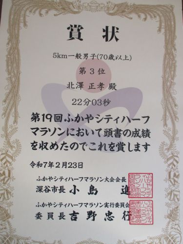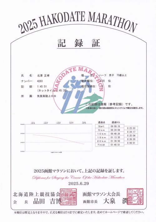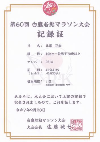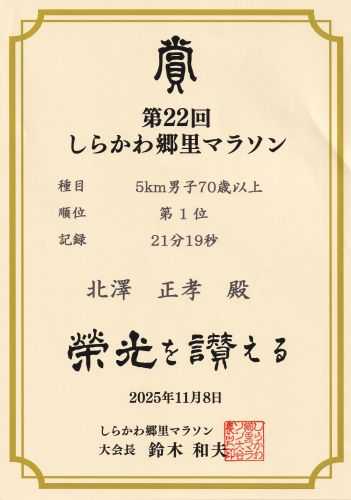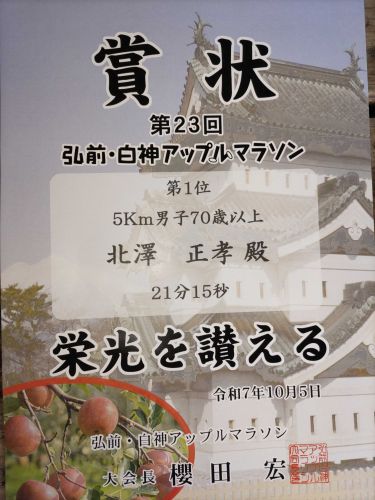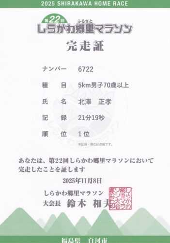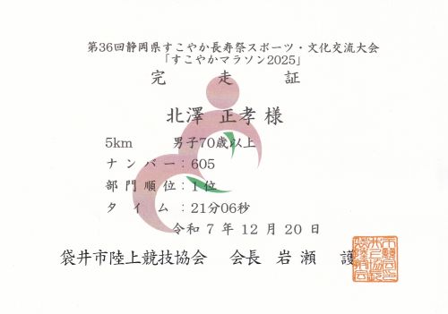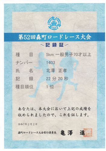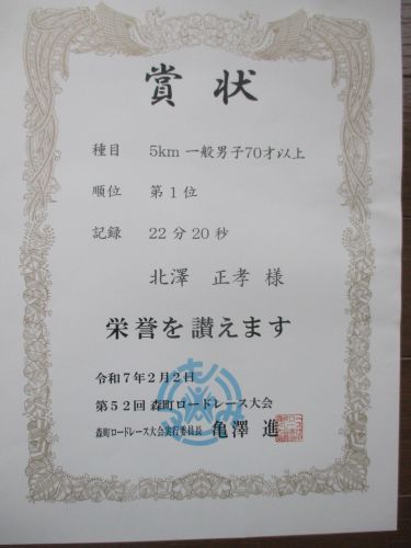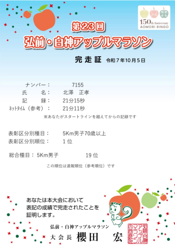 平坦コースなら待望の20分台で走れたような気がしました。余談ですが、表彰式の時に司会者から冗談ですが、「本当に70歳代ですか。