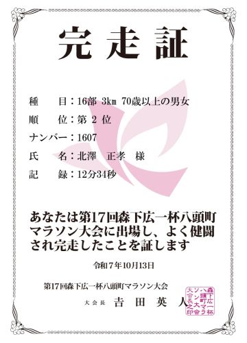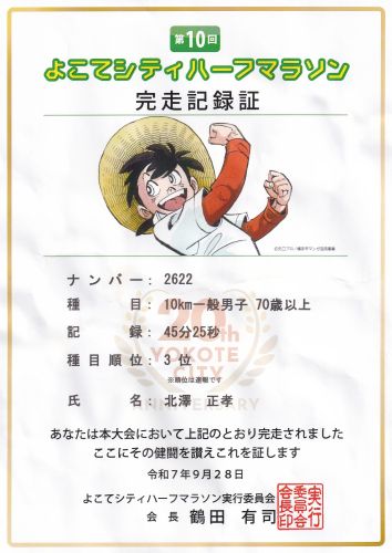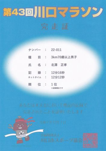 順位が最後まで分かりませんでした。ゴールした時に70歳以上の部1位と聞かされようやく自分の順位がわかりました。タイムはまあまあで