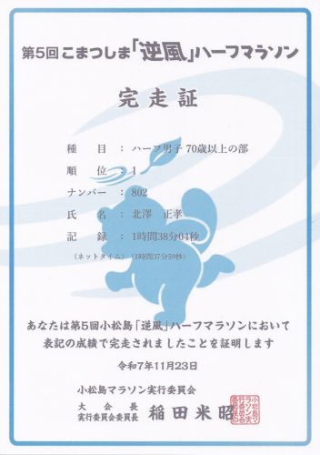 ハーフ 70歳以上の部 優勝 1時間38分04秒