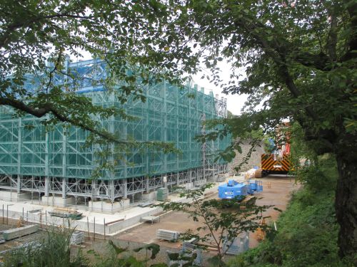 弘前城本丸東面の石垣には、以前から膨らみが確認されており、崩落する危険性から、石垣を解体修理することになり、 平成27年7月〜9月にかけて天守を