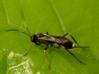蛾の仲間にはミノガ以外にも種々の材料で体を覆う種類がいます。どの蛾の幼虫も小型なので人の目に付くことは滅多にありません。ここで紹介するのはマダラマルハヒラズコガ幼虫の愛嬌のあるヒョウタン型カプセルです。材料は樹皮・コケ類などのようですがミノムシと違って頭を出す場所が前後にあります。移動する方法はミノムシと同じ、匍匐前進型で、体をミノの外に伸ばし、胸脚でミノを引き寄せる動作を繰り返します。別名はツズミミノムシです。成虫は地味な色と形で、地面の枯れ葉の裏などに潜んでいるので、飼育しない限り観察することは出来ません。こんな幼虫を相手に自分の子孫を残すために寄生するハチがいます。ヒメバチ一種で腹部の先端が白いのが印象的です。