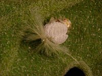 このごろ庭や灌木のあるところにはどこでも白い綿のようなハゴロモ類の幼虫が目立ちます。ちょっとさわると幼虫がぴょこんと跳ねびっくりさせられます。この虫にはハゴロモヤドリガという小さな蛾の幼虫が寄生するのをご存じでしょうか?虫眼鏡が必要な私ですが目のよい人ならハゴロモの背中に背負われている蛾の幼虫わかります。