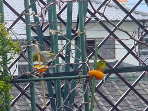 | ベランダにみかんを置くとメジロがやって来ます。 メジロは、家の山茶花に蜜を吸いにやって来ています。 綺麗な抹茶色の体を持ち、甲高い声で賑やかに鳴く可愛らしい鳥です。 |