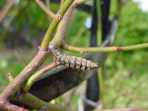 毎年ある「もずのはやにえ」ですが、今年は面白いものを見つけました。 しかも、何箇所にもありましたね〜。 バラの枝に刺したアメリカミズアブの幼虫です(^^; 私は、生ごみ堆肥を作る際に発生したアブの幼虫を気にせず花壇の土に混ぜるのですが・・・ きっと土の上層部をウジウジしていたのでしょう。 モズの目に止まり、このような姿になっていました。 |