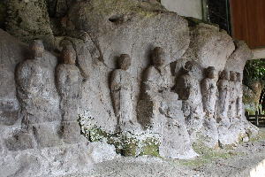 | 国東半島のほぼ中央、両子山にある。両子寺といえば、参道入り口にある石造の仁王像 | 岩をくりぬいたて建てられた奥の院。中には岩から清水が湧き出ています | 国東塔 国東半島独特の五輪塔。台座に蓮華座が特徴 |