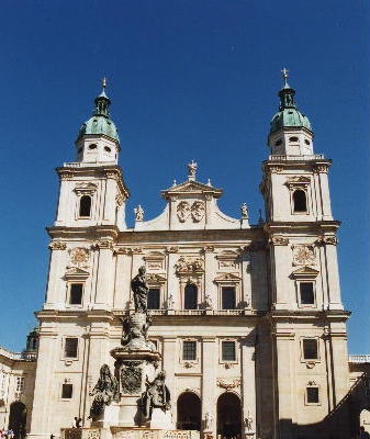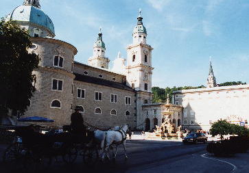| ← レジデンツ広場(Residenzplatz) 大司教の宮殿(レジデンツ)前の広場。 バロック式の噴水は、マリアが修道院から トラップ家に向かう時に登場。 |