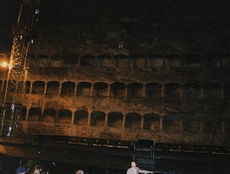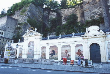 | フェルゼンライトシューレ (Felsenreitschule) ザルツブルグ音楽祭の中心になる祝祭劇場。 その中のフェルゼンライトシューレは、メンヒスベルクの岩山をくりぬいて、ホールとして使用している。 見学にはドイツ語、英語のツアーに参加する。 映画のラストで、トラップファミリーが音楽祭に出場して、優勝します。その時使用した音楽ホールです。 |