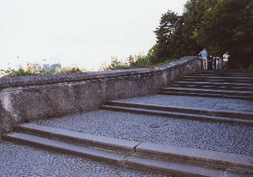 | メンヒスベルク(Monchsberg)の石段 旧市街の裏手に見える山は、メンヒスベルクという。上まではエレベーターでも上がれます。 マリアと子供達がこの石段で、「ドレミの歌」の練習をしました。 |