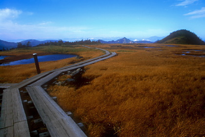晩秋の湿原は人気もなく、木道がひたすら続く。