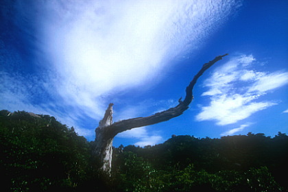 白く白骨化した杉が青空を指す。