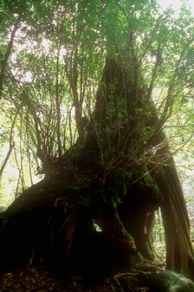 その二代目の杉が切り倒され、切株の上にさらに新しい杉が生えて覆い尽くす「切株更新」。