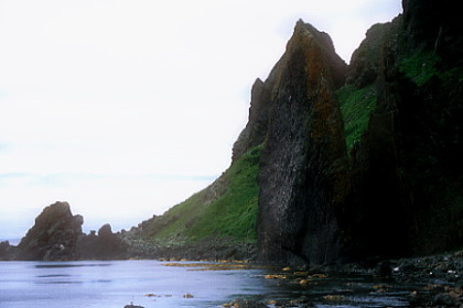 岩がスパッと割れて、海岸にそびえたっている。