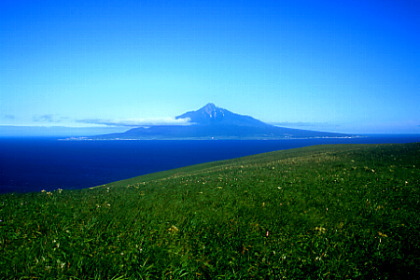 花畑の向こうの青い海、青い空に浮かぶ美しい姿に釘付けになる。
