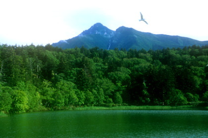 緑に囲まれた姫沼からは、利尻山を臨むことができる。