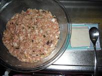 C 生姜をみじん切りに D 器に豚挽肉、A、B、C E Dと焼売の皮と