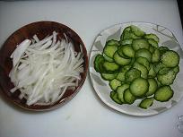 C Bをボウルに入れ、 D きゅうりは1〜2mm程の E Dのきゅうりを塩で