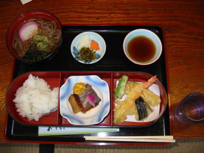 きららセット700円 (そば、てんぷら、ぶり煮物、ごはん、お新香)