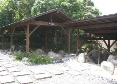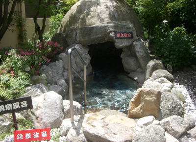 | 庭木に覆われた、緑いっぱいの露天風呂は心身共に癒される | 露天風呂に一部には洞窟温泉も作られている |