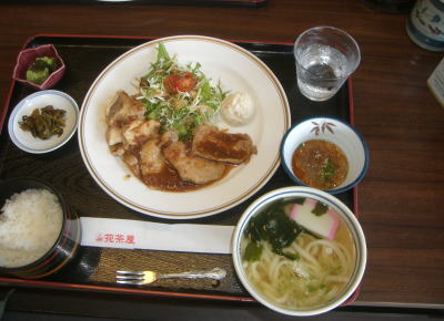 | レストラン花茶屋 ランチ・入浴セット(1,400円)で入館したので、選べるメニューはしょうが焼き定食、ハンバーグ定食、とんかつ定食(950円相当)の中から1つ | 写真はしょうが焼き定食、食事だけの場合は950円 |