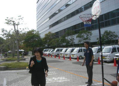 | 2010 RKBラジオまつり入場ゲート | プロバスケットチーム’ライジング’の協賛によるフリースローゲーム。2球とも入れることがればライジングの試合チケットがゲットできるのだが、実力どおり2球ともはずしました。 | |