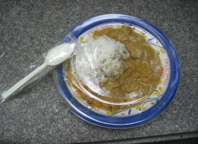 | 田中みずきアナウンサーでしょうか?とてもきれいな方でした。福岡タワー内で | 広場の片隅でカレーと肉巻きおにぎりをを食べているところでした。 | |