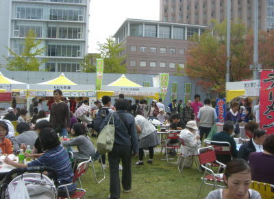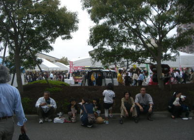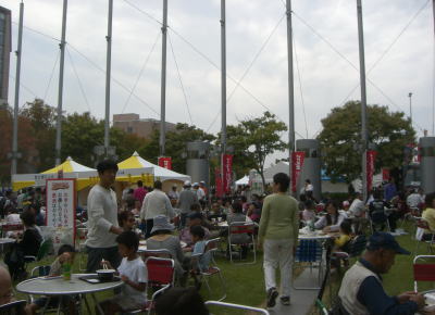 | ラーメンやうどん、カレーなどのお店が並んでいる広場。 この日は曇り空ですごしやすく、どこのお店も行列ができていた。 | ||