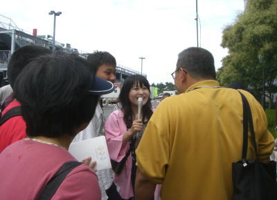 | 宮崎憲一アナウンサーが来場者にインタビューを行っていました | ’あべちゃん&トシ坊こりない二人’の放送中。 場面は現場中継中で竹下アナウンサー(?)が来場者にインタービュー | |