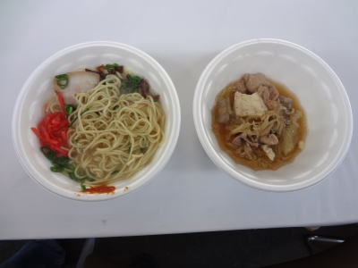 | 昼食は久留米ラーメン(200円)とホルモン鍋(200円)を頂ました | 麒麟麦酒のコスモス園会場。バックの建物はキリンのビール工場 | |