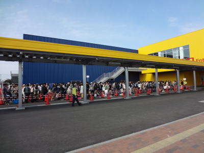 | オープンして5日目、初めての日曜日。待ちに待っていたイケアに行ってきました。 | イケアに7時30分頃到着。会場には40台ほどの車が並んでいたが人影はまばら。少し早すぎた感じ。でも、オープンの時間になると何重にも列が出来ていた。 | |