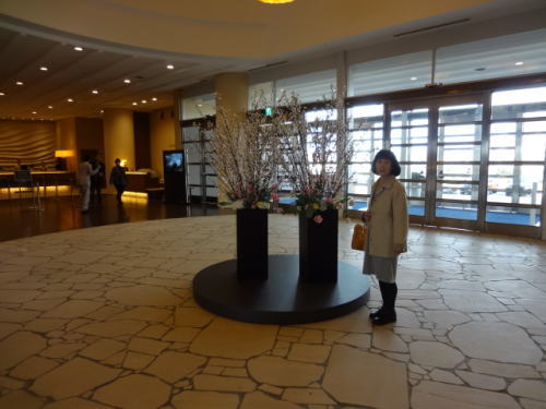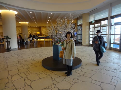 | ヒルトンホテルフロント前、桜が飾られている | ホテルフロント前で記念撮影 | |